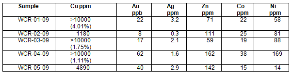The western end of the Property, will also receive a more detailed geological inspection during this phase of the exploration. The mineralization exposed here is mainly malachite (copper oxide) and is contained in meta-sedimentary gneiss. Previous sampling assayed up to 6.4 % Cu. The current program confirmed the high Cu levels and also that Au is present as well. One sample assayed at 420 ppb Au.